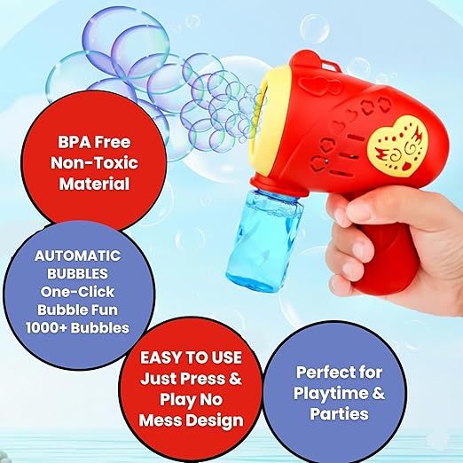 Make playtime magical with this Musical Bubble Gun for Kids. Designed with a powerful 15-hole electric bubble machine, it creates thousands of bubbles in seconds while colorful LED lights and cheerful music add extra excitement. The bubble gun toy includes one bubble solution bottle and is easy for little hands to use. Durable, lightweight, and safe, this bubble gun with music is perfect for indoor or outdoor fun, parties, and playdates. Ideal as a bubble gun machine that kids love, it keeps children entertained, active, and smiling with non-stop bubbles, music, and bright visual effects, making it perfect for birthdays, gifts, and summer adventures.